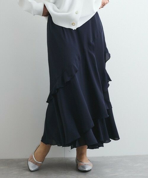 アシンメトリーでバイアスに施されたラッフルのレイヤードデザインが春風になびく軽やかな動きを演出するフレアスカートです。