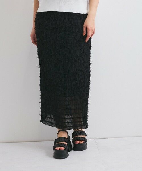 均等にシャーリングの施されたシフォン素材のIラインスカートです。