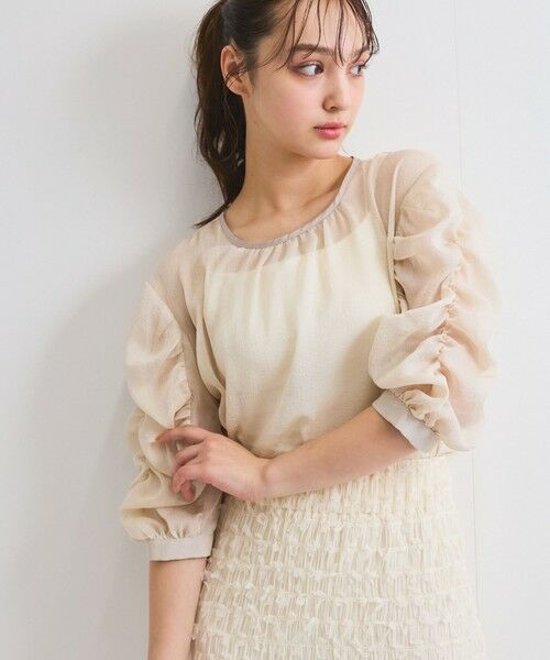 アームセンター部分にゴムギャザーをいれてボリューム感を調整し、カーヴィに切り替えて、立体的なスリーブデザインがポイントのプルオンタイプのフェミニンTブラウスです。