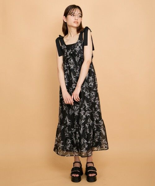 ストラップショルダー部分がワイドリボンデザイン、バスト下にフリルをあしらったフラワー柄ワンピース。