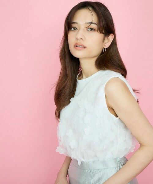シアーメッシュ地に大きさの異なる3Dフラワーモチーフをあしらったレイヤード風トップスは一枚で主役級のトップスです。