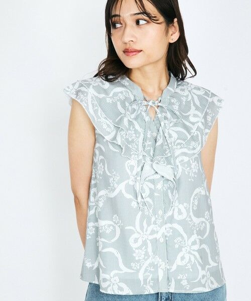 シアーストライプ柄にリボンフラワー柄が施されたダブルラッフルカラーデザインのブラウスです。