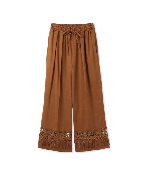 裾から少し上の部分にフリンジレースが装飾され、ほのかな肌見せのデザインになっており、軽やかな足元を演出します。
