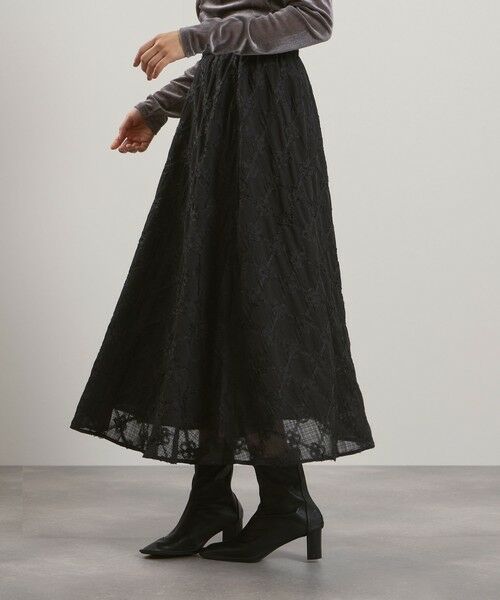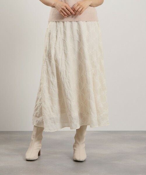 格子の重なり部分にフラワーモチーフの刺繍が施されてチェック柄のように表現されたフレアスカートです。