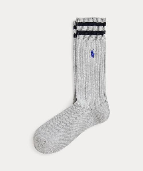 ざっくり編みのリブニット構造でデザインしたコットン混紡クルーソックス。ストライプのカフスとシグネチャーのポニー刺繍が特徴・リブカフス・左右のソックスの外側にシグネチャーのポニー刺繍※商品の色味は、光のあたり具合など諸条件により色感が多少異なって見える場合がございますので予めご了承下さい。・サイズ:22-24cm
