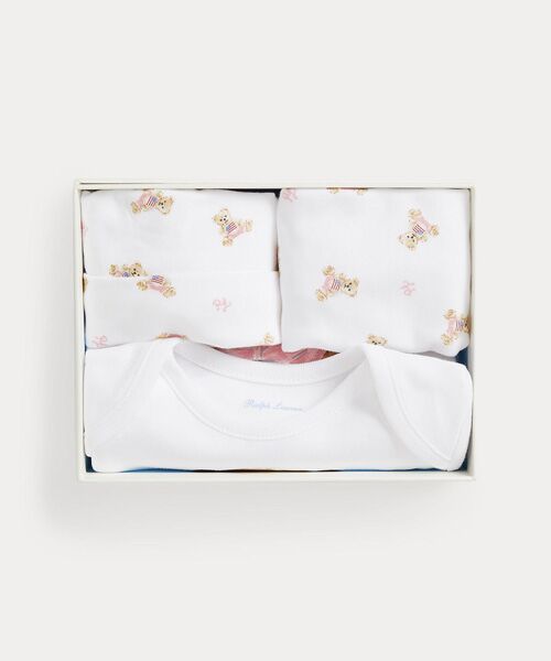 柔らかなコットンで仕立て、チャーミングなPoloベアのモチーフをプリントした、長袖のボディスーツ、ビブ、ビーニーハットが入ったギフトセット。