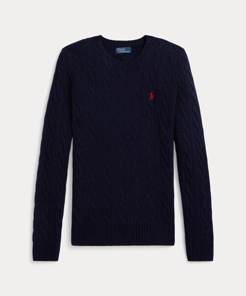 Poloの定番のスリムフィットのクルーネックセーター。柔らかなウールとカシミヤの混紡を使用し、シグネチャーのケーブルニット構造で仕立てた一枚・スリムフィット / 腰丈・リブニットのクルーネック・長袖、リブニットのカフス・リブニットの裾・左胸にシグネチャーのポニー刺繍・モデル身長178cm、着用サイズS※商品の色味は、光のあたり具合など諸条件により色感が多少異なって見える場合がございますので予めご了承下さい