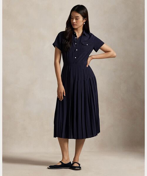 なめらかなシルククレープを使用した半袖のシャツドレス。クラシックなスプレッドカラー、ボタン付き前立て、プリーツ入りのAラインスカートを組み合わせたアイテム。・Aラインのシルエット / くるぶしよりやや上の着丈・スプレッドカラー / ボタン付きハーフプラケット / 蝶貝ボタン / 左サイドシームに隠しジップ留め・半袖 / 胸にボタン付きフラップパッチポケット2つ・飾りステッチを施した縫い付けられたウエストバンド / プリーツスカート / フロントと背面にダーツ・モデル身長178cm、着用サイズS※商品の色味は、光のあたり具合など諸条件により色感が多少異なって見える場合がございますので予めご了承下さい