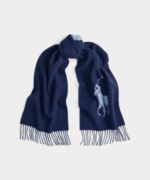 ウールのマフラー。フリンジのトリムと、ダブルニットで描かれたシグネチャーのBig Ponyが特徴・フリンジトリム・片端にシダブルニットのシグネチャーのBig Pony