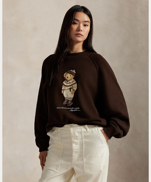 ガーメントウォッシュ加工を施したフリースを使用し、寒い季節のRalph Laurenルックに身を包んだPoloベアのラバープリントをあしらったクルーネック プルオーバー