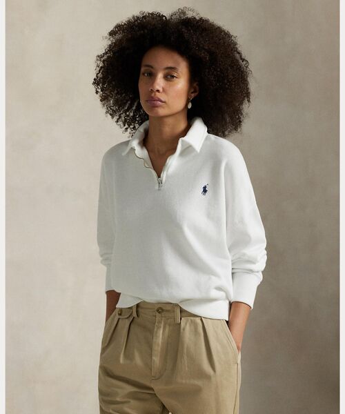 ポニー刺繍でシグネチャーの仕上がりをプラスしたクォータージップのプルオーバー。コームドコットンとリングスパンコットンを使用した薄手のフリースで仕立て、この上なく柔らかな手触りを実現
