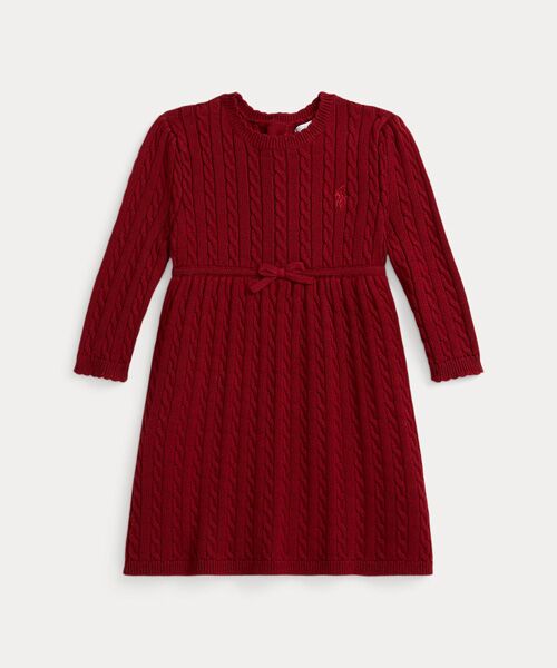 ミニケーブルニットパターン、スカラップトリム、ウエストのリボンが特徴的なコームドコットンのドレス。