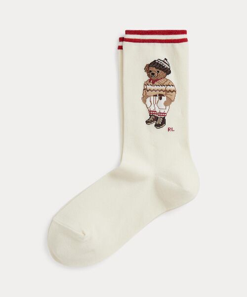 柔らかいコットン混紡素材を使用した薄手のクルーソックス。シグネチャーのルックのひとつに身を包んだアイコニックなマスコットが特徴・ストライプのティッピングを施したリブカフス・左右のソックスの外側にPoloベアとRLの編み込み。※商品の色味は、光のあたり具合など諸条件により色感が多少異なって見える場合がございますので予めご了承下さい。