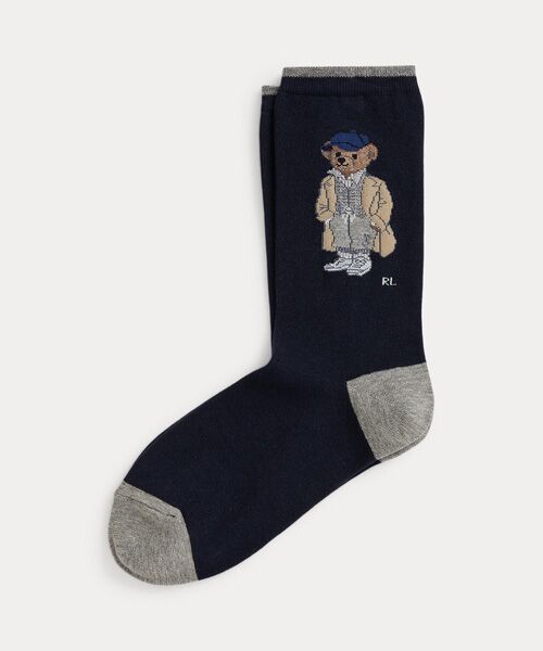 柔らかいコットン混紡素材を使用したクルーソックス。シグネチャーのルックのひとつに身を包んだアイコニックなマスコットが特徴・コントラストティップを施したリブカフス・コントラストの効いたかかととつま先・左右のソックスの外側にPoloベアとRLの編み込み。※商品の色味は、光のあたり具合など諸条件により色感が多少異なって見える場合がございますので予めご了承下さい。