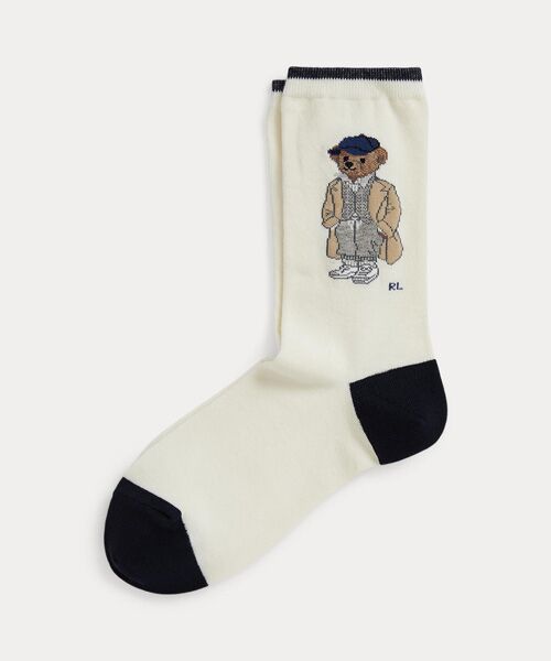 柔らかいコットン混紡素材を使用したクルーソックス。シグネチャーのルックのひとつに身を包んだアイコニックなマスコットが特徴・コントラストティップを施したリブカフス・コントラストの効いたかかととつま先・左右のソックスの外側にPoloベアとRLの編み込み。※商品の色味は、光のあたり具合など諸条件により色感が多少異なって見える場合がございますので予めご了承下さい。