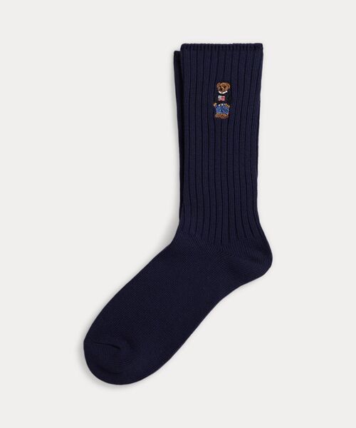 アイコンを身にまとうアイコン。Ralph Laurenのフラッグセーターを身に着けたPoloベアをあしらい、しっかりとしたコットン混紡糸を編み上げたクラシックなクルーソックス・リブカフス・左右のソックスの外側にPoloベアの刺繍。※商品の色味は、光のあたり具合など諸条件により色感が多少異なって見える場合がございますので予めご了承下さい。