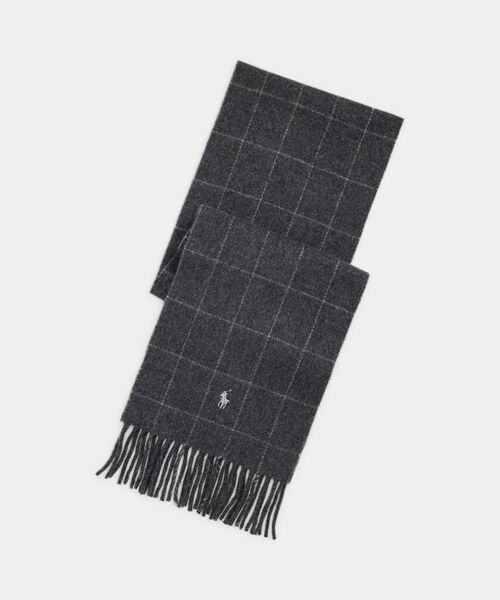 柔らかいウール混紡素材を使用したマフラー。片面のウィンドウペンモチーフと、裏面の無地の組み合わせが特徴・両端にロープフリンジ・片端にシグネチャーのポニー刺繍※注意:柄の配置は、商品によって異なります。