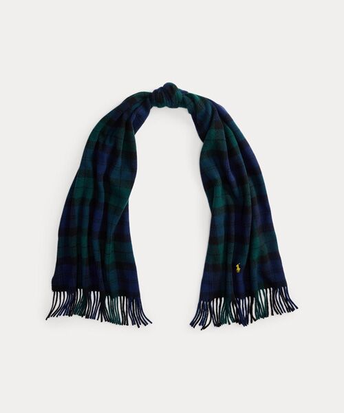 ニュートラルな色合いのチェック柄が特徴のクラシックなウールマフラー。軽やかなフリンジ付きのトリムとシグネチャーのポニー刺繍がアクセント・フリンジトリム・片端にシグネチャーのポニー刺繍※注意:柄の配置は、商品によって異なります。
