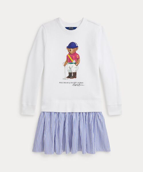 ピーチスキン加工を施したフリースのトップス部分、ストライプ入りのポプリンスカート、自分の名前の由来となったポロ競技のユニフォームをまとった人気のPoloベアのプリントをデザインに取り入れたコットン混紡のドレス。・ストレートフィット・クルーネック・長袖、リブカフス / フロント中央にPoloベア、Polo Bear by Ralph LaurenとRalph Laurenの文字のプリント・トップス部分にリブの裾・ポプリン織り地のスカート※商品の色味は、光のあたり具合など諸条件により色感が多少異なって見える場合がございますので予めご了承下さい。※注意:柄の配置は、商品によって異なります。