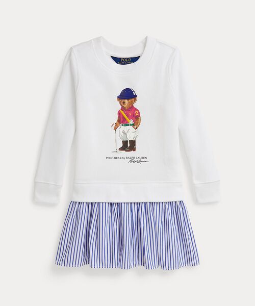 ピーチスキン加工を施したフリースのトップス部分、ストライプ入りのポプリンスカート、自分の名前の由来となったポロ競技のユニフォームをまとった人気のPoloベアのプリントをデザインに取り入れたコットン混紡のドレス。・ドロップウエストのシルエット・クルーネック・長袖、リブカフス / フロント中央にPoloベア、Polo Bear by Ralph LaurenとRalph Laurenの文字のプリント・トップス部分にリブの裾・ポプリン織り地のスカート※商品の色味は、光のあたり具合など諸条件により色感が多少異なって見える場合がございますので予めご了承下さい。※注意:柄の配置は、商品によって異なります。