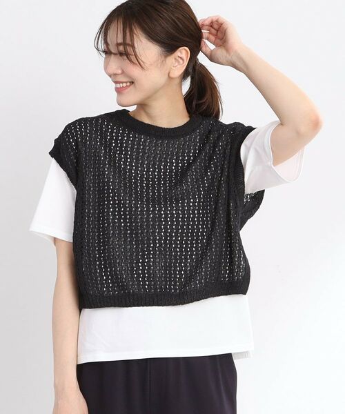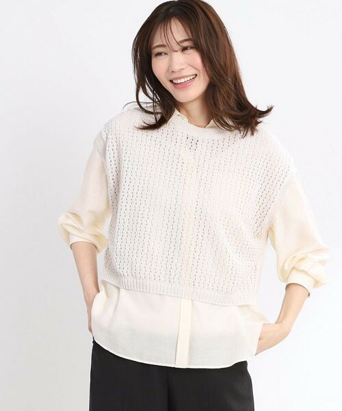 ケーブルとメッシュの編地が軽ろかで、甘過ぎない柄のニットベスト。