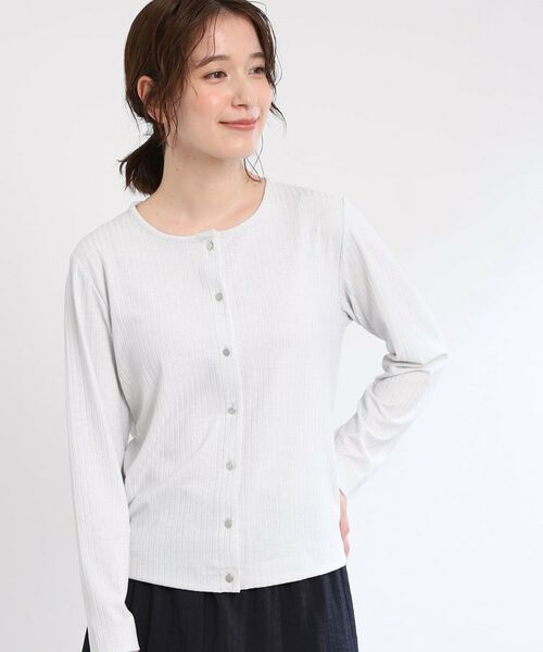 【デザイン】ボタンはドット風に金属にしており、前を閉じて一枚着としてもお召しいただけるカーディガン。ジャージ素材でおつくりしたカーディガンですので取り扱いやすく、気軽に羽織っていただけます。【素材】さらっととした肌触りで、編み柄にラメの入ったジャージ素材です。※照明の関係により、実際よりも色味が違って見える場合があります。また、パソコン・スマートフォンなどの環境により、若干製品と画像のカラーが異なる場合もございます。本商品は、ご注文確定後に取り寄せにてお客様への出荷手配をさせていただきますので、お届けまでに7~10日前後かかる場合がございます。また、商品は他社サイトと在庫を共有しているため、ご注文いただいた商品が欠品となり、キャンセルとなる場合がございます。
