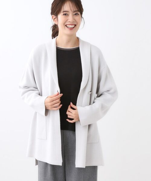 ショールカラーで金属金具が上品に見えるようにし、裾幅を広くすることで、羽織るだけで決まるようなシルエットになっています。