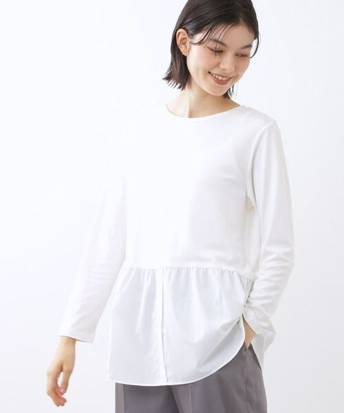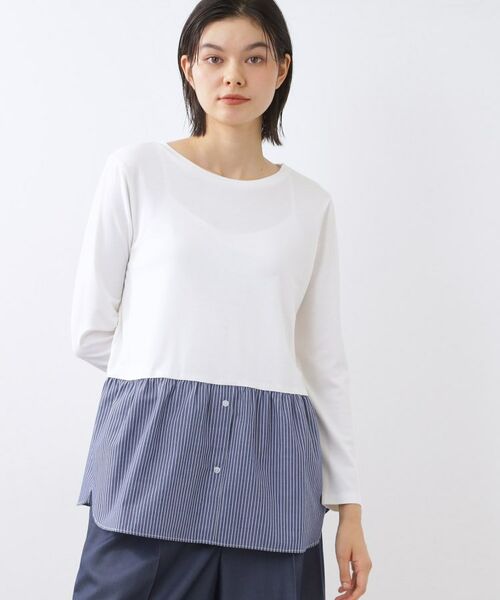 薄地の組み合わせなので暑さも気にせず着用でき、ベストやニットをレイヤードした際に、裾からさりげなくシャツを着ているように見えるのがポイントです。