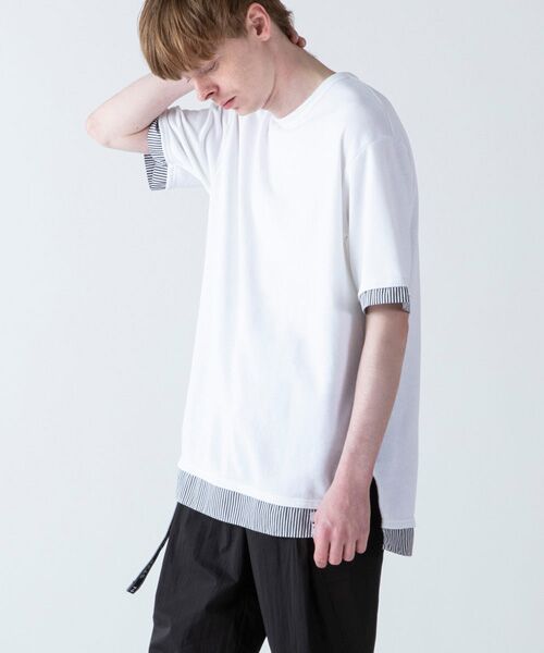 【 生地 】裏をパイル編みした肌さわりのいいコットン生地を使用したカットソーです。カットソーの生地に布帛のストライプ生地を組みわせて使用しています。【 デザイン・シルエット 】袖と裾の部分に異素材を組み合わせ、シャツとレイヤードしているようなデザインのカットソーです。シルエットはドロップショルダーで身幅もゆとりを持たせているのでトレンドのゆったりとした着こなしが楽しめます。ロンTと組みわせるなど色々なスタイリングに使えるアイテムです。