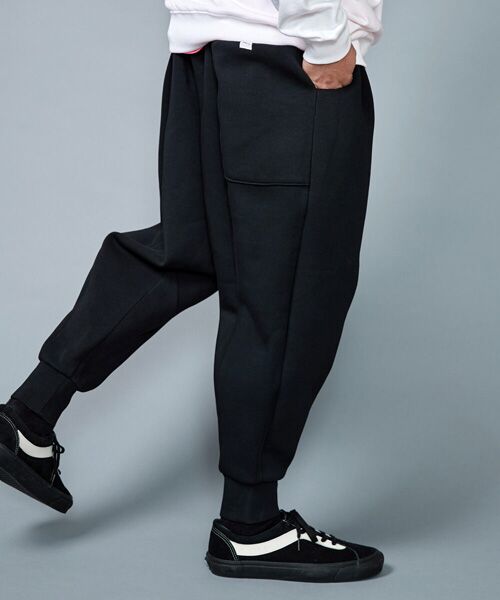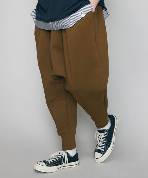 【 生地 】スポンジを包み込んだようにふっくらと柔らかく、かつ着た瞬間からわかる軽さが特徴的なダンボール素材を使用しています。柔らかさを際立たせるためシリコン系柔軟を使用しポリウレタン糸を組み合わせることでストレッチ性の高いキックバックもある万能タイプの生地です。ツルツルとした滑らかさで、高級感ある表情が特徴的です。シワがつかないイージーケアの素材なのでワードローブに取り入れやすい素材です。【 デザイン・シルエット 】 打ち込みが良く、ふっくらとした3段スムースジャージ素材のイージーワイドパンツ。高い速乾性、通気性を持つ機能素材でスポーティーに仕上げながら、深く取ったタックや上品な裾の折り返し処理など、民族衣装であるサルエルパンツをrehacerらしいスッキリとしたシルエットに仕上げました。
