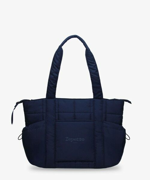 ふんわりとしたキルティングのトートバッグ。フロントにはブランドロゴ入りの大きなポケットが使いやすく、スタイリッシュなアクセント。開閉はチャック仕様で安心。マチがあり、お出かけに充分な収納力。デイリーに活躍するアイテムです。