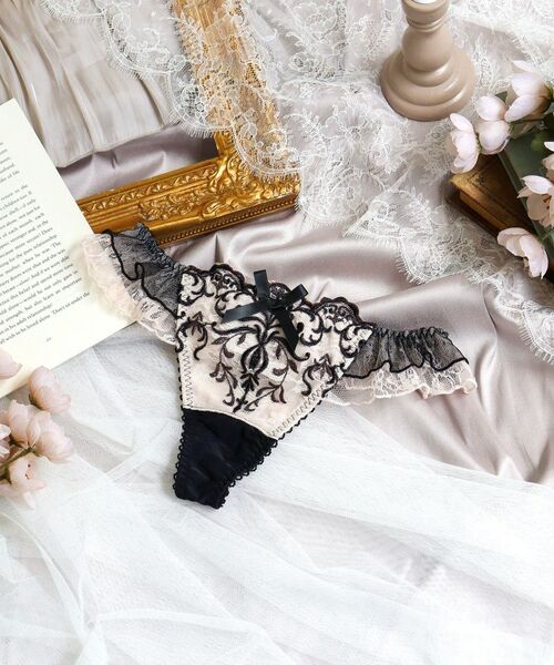 ウエストからバック部分にかけてギャザーを入れたチュールとラッセルレースを重ねて、Tバックだけの心ときめく特別なデザインに。