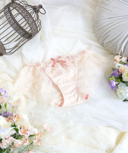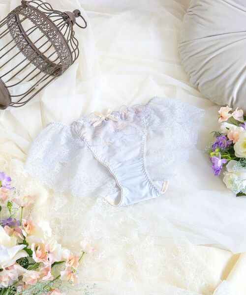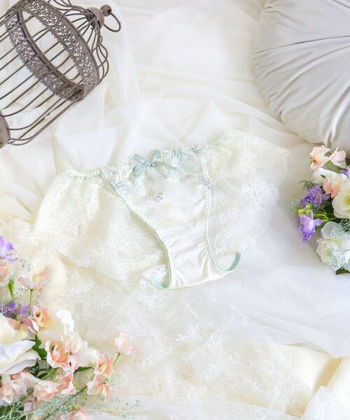 後身生地は総レースになっており、伸縮性のあるレースが肌に心地よくフィットします。足口にはゴムを使っていないので食い込まず、少しゆとりをもった履き心地です。ボトムスへもショーツラインが響きません。