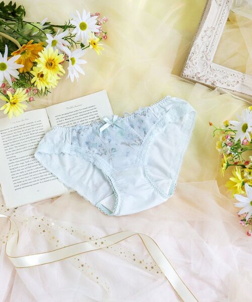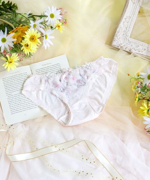 野原に咲きほこるタンポポや小花をモチーフにしたシリーズです。フロントレースにあしらったタンポポの綿毛は、やわらかいウーリー糸で刺しゅうすることで、ふわふわと軽やかな印象に。周りに散りばめた小花にはふんだんにラメ糸をほどこし、繊細なきらめきが華やかさをプラスしています。スカラップにはポコポコしたエッジとドット柄をあしらい、あどけない女の子らしさを演出しました。花々が風に揺られて空を飛んでいくような、ロマンティックなときめきを詰め込んだコレクションです。
