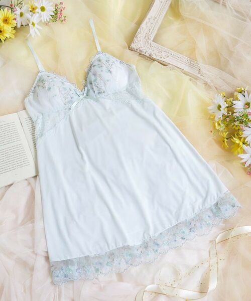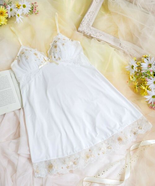 野原に咲きほこるタンポポや小花をモチーフにしたシリーズです。カップレースにあしらったタンポポの綿毛は、やわらかいウーリー糸で刺しゅうすることで、ふわふわと軽やかな印象に。周りに散りばめた小花にはふんだんにラメ糸をほどこし、繊細なきらめきが華やかさをプラスしています。スカラップにはポコポコしたエッジとドット柄をあしらい、あどけない女の子らしさを演出。裾にもお揃いのレースをふんだんに使用して、可愛らしさあふれるディテールに仕上がりました。カップ下はストレッチレースで切り替えて、さりげなくスタイルアップも叶います。花々が風に揺られて空を飛んでいくような、ロマンティックなときめきを詰め込んだコレクションです。