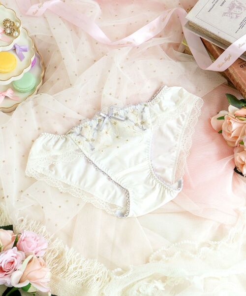 マーガレットのアーチをイメージした、ピュアで可愛らしいシリーズです。レースにはぷっくりとしたステッチでアーチのような半円のデザインをあしらい、チェック柄やスカラップのドット柄を組み合わせて、とびきりガーリーなスタイルに仕上がりました。全体に散りばめた小さなマーガレットのお花は、ウーリー糸で刺しゅうすることで、上品なフェミニンさを演出。ポイントでほどこしたラメ糸はキラキラと繊細なきらめきで、さりげない華やかさをプラスしました。