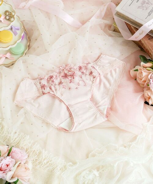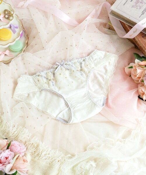マーガレットのアーチをイメージした、ピュアで可愛らしいシリーズです。レースにはぷっくりとしたステッチでアーチのような半円のデザインをあしらい、チェック柄やスカラップのドット柄を組み合わせて、とびきりガーリーなスタイルに仕上がりました。全体に散りばめた小さなマーガレットのお花は、ウーリー糸で刺しゅうすることで、上品なフェミニンさを演出。ポイントでほどこしたラメ糸はキラキラと繊細なきらめきで、さりげない華やかさをプラスしました。