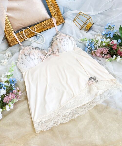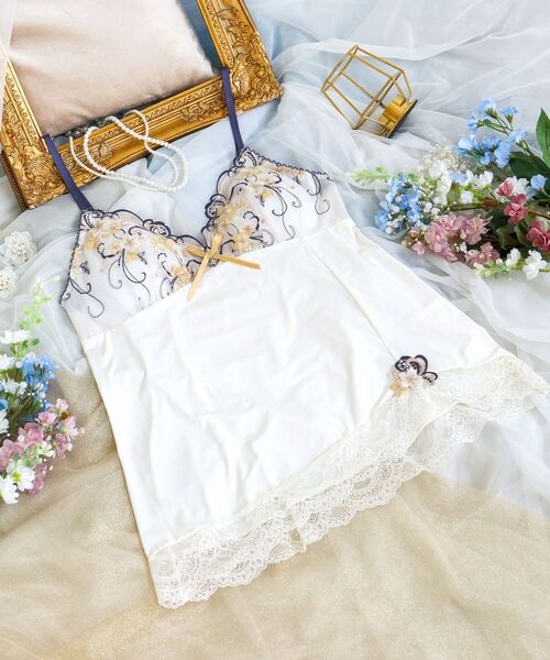 咲きほこる二輪草をイメージしたお花と、ツタを表現した曲線をふんだんにあしらったシリーズです。二輪草はあたたかみのあるウーリー糸で刺繍して、やわらかく可愛らしい表情をプラス。対照的に色とりどりの曲線は太めのステッチやラメ糸、ドット柄をほどこすことで、ひときわ華やかな印象に仕上がりました。まるで二輪草が光に照らされているかのような、きらめきが幾重にも折り重なる、幻想的な世界観を表現しています。カップの中央にはキラキラと輝くストーンチャームをあしらいました。身生地はアシンメトリーなカッティングと、裾の幅広レースで大人の上品さを演出。ポイントでインパクトのあるアップリケをプラスしました。バックスタイルは小さなリボンをほどこした、デイリー使いしやすいベーシックなデザインに。色使いは全体的にはっきりとした配色で、おしゃれで豪華な印象の新しいリサマリをお楽しみいただけます。