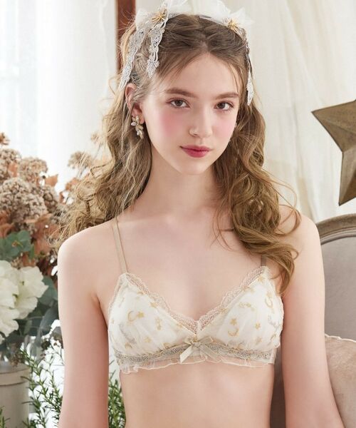 夜空に浮かぶリサマリの星座をイメージした、ルームコレクションです。レースにラメ糸でたくさんの星や月を刺繍することで、全体がキラキラと輝き、ひときわロマンティックなデザインに仕上がりました。リサマリのロゴにはさりげなく星をプラスして、流れ星のような遊び心を演出。カップ下のケミカルナローレースにもお星さまやリサマリロゴをあしらいました。透け感のあるふんわりしたチュールレースも、あどけない可愛らしさを後押し。色使いは季節感を取り入れた、上品なヌーディーカラーでまとめました。「ホリー」シリーズを身に着けて、心ときめく夜になりますように。そんな願いを込めてお届けいたします。