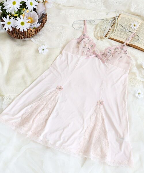 マーガレットのお花をやさしい印象のウーリー糸で立体的に表現したシリーズです。メインのマーガレットは花びら一つ一つをステッチで縁取り、グラデーションをほどこすことでインパクトのある華やかさをプラス。大小様々な形のお花を全体に散りばめて、マーガレット畑を詰め込んだような、奥行きと動きのある印象に仕上がりました。ポイントでラメ糸をほどこして、ほのかなきらめきがガーリーな可愛らしさを演出します。身生地はV字で切り替えて、透け感のあるストレッチレースが揺れるフレアシルエットに。スカラップを活かすレース使いと小さなマーガレットのアップリケで、女の子らしさを後押しします。色展開はフェミニンな上品さのあるカラーでまとめた、日常を少しHappyにしてくれるようなコレクションです。