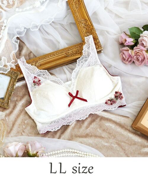 バラのお花と小花をモチーフにした豪華でエレガントなシリーズです。おやすみブラはワイヤーブラと印象を変え、リラックスタイムをサポートできるレーシーなデザインに仕上がりました。アシンメトリーにあしらわれたお花のアップリケには、色とりどりの刺繍糸をほどこしてインパクトを持たせつつも、女性らしい印象に。