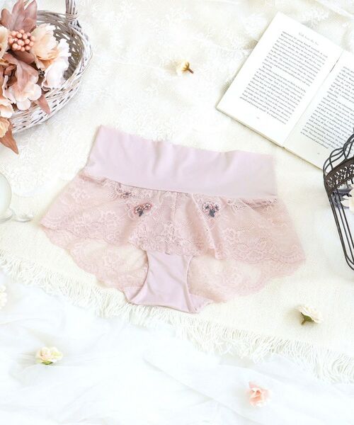 レースを贅沢にあしらった、さらりとした気持ちの良い履き心地です。ウエストにはゴムを使用せず袋縫いにすることで、締め付け感がなくストレスフリーにご着用いただけます。クロッチ部分にも同じ伸縮性のあるなめらかな素材を使用しました。敏感な肌の方にも安心してご着用いただけるよう、フロントレースの裏打ちに綿混を使用するこだわりも。履き込みは深く安定感があり、ゆとりのある作りで就寝時やリラックスタイムにおすすめです。