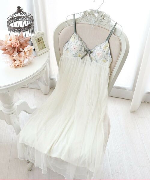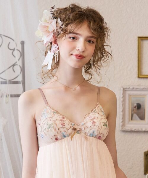 大きなアーチの中に小花や英文字を散りばめた、オリジナリティあふれるシリーズです。リサマリの象徴でもあるお花は、繊細なステッチで3色のグラデーションにすることで、花束のような華やかさを演出。その周りにはアーチに沿うように手描き風の幾何学模様や、Pretty plants、Color with flowerの英文字を入れて、インパクトのあるアーチを素朴で可愛らしい印象に仕上げました。身生地はたっぷりのチュールで切り替えることで、ふんわりとした女の子らしいシルエットが完成。バックスタイルはストレッチレースをV字にカッティングした立体的なデザインで、小花のアップリケとリボンをあしらいました。どこから見ても心ときめくディテールを詰め込んだ、ルームランジェリーをお楽しみください。