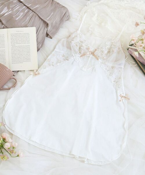 アンティークレースをあしらったウェディングドレスをイメージしたシリーズです。レースにあしらわれた小花は、パッカー手法とアップリケを組み合わせて、華やかで立体的な印象に仕上がりました。その周りにはさりげなくチェック柄をほどこすことで、クラシカルな表情に。アップリケのラインストーンと全体にあしらわれた繊細なラメ糸が、キラキラと上品な輝きを演出します。バスト下はストレッチレースと刺繍レースで大胆に切り替えて、異なる肌の透け感がラグジュアリーな印象に。身生地には深めのスリットとリボンをプラスして、ラウンドカットした裾が動くたびにふんわりと揺れる、可愛らしいシルエットが完成しました。カラーもウェディングドレスを連想させる、大人の気品あふれるWhite・Gray・Mintのワントーンで展開しています。