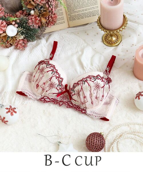 キラキラと揺れるオーナメントをモチーフにした、リサマリのクリスマスコレクションです。レースには窓辺に飾られているリボンやモミの木、ベルや鈴をふんだんに刺繍して、オーナメントがゆらゆらと揺れている様子を可愛らしく表現。窓の外に降り積もる雪の結晶を、たっぷりのラメ糸で豪華にあしらいました。カップ上辺はシンプルなレースで2段になるよう切り替えて、刺繍1つ1つを引き立たせるナチュラルな上品さを演出。ストラップにもオーナメントをイメージしたアップリケを添えて、ホリデー気分高まる特別感をプラスしています。年に1度のクリスマスシーズンは、Risa Magliのランジェリーでヒロインに。心ときめく素敵なひと時をお過ごしください。