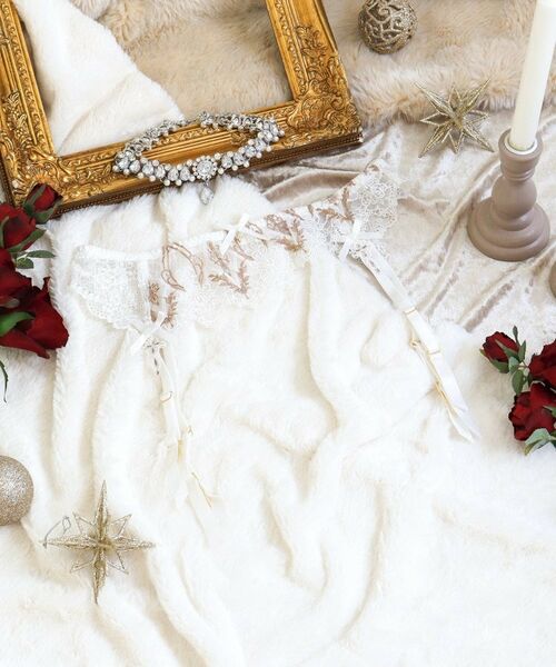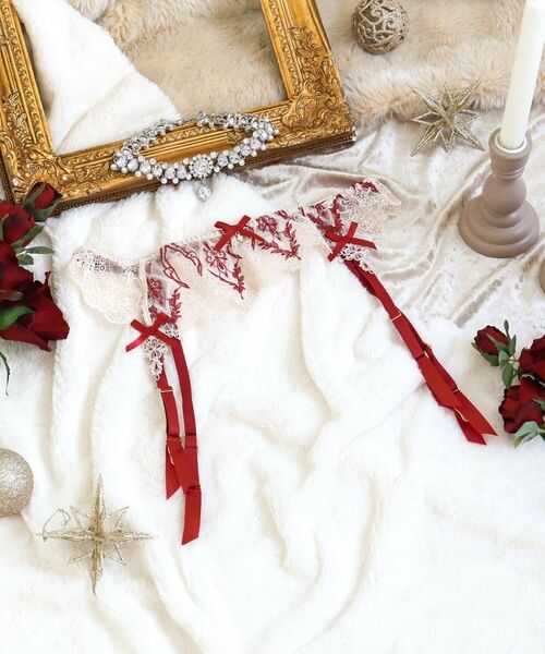クリスマスには欠かせないスワッグや壁飾りをモチーフにした、リサマリのクリスマスコレクションです。アシンメトリーにカッティングしたレースには、全体に幾何学模様をあしらい、ひときわ華やかな仕上がりに。ふんだんにラメ糸を刺繍して、気品あふれる輝きと斬新なカラーリングが、エレガントな大人のクリスマスを演出します。フロント中央のリボンには揺れるラインストーンを、ストラップにはリボンとサーモカットのアップリケをあしらい、可愛らしさをプラスしました。年に1度のクリスマスシーズンは、Risa Magliのランジェリーでヒロインに。ワンランク上の美しさを演出した 「Risa Magli Reine(レーヌ)」ブランドの世界観をお楽しみください。