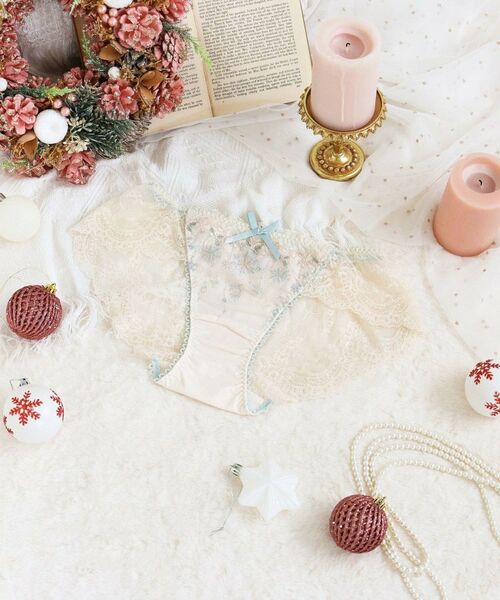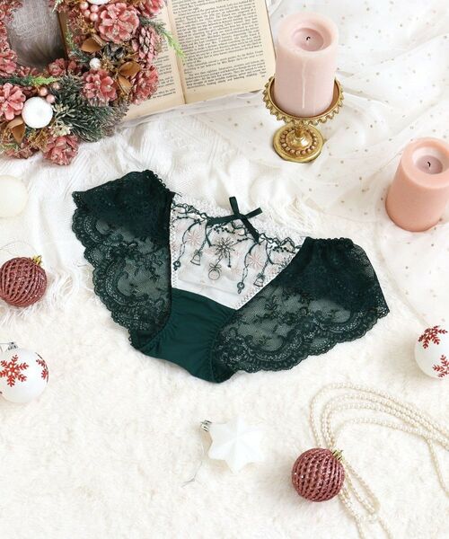 キラキラと揺れるオーナメントをモチーフにした、リサマリのクリスマスコレクションです。レースには窓辺に飾られているリボンやモミの木、ベルや鈴をふんだんに刺繍して、オーナメントがゆらゆらと揺れている様子を可愛らしく表現。窓の外に降り積もる雪の結晶を、たっぷりのラメ糸で豪華にあしらいました。フロント上辺はシンプルなレースで2段になるよう切り替えて、刺繍1つ1つを引き立たせるナチュラルな上品さを演出しています。年に1度のクリスマスシーズンは、Risa Magliのランジェリーでヒロインに。心ときめく素敵なひと時をお過ごしください。