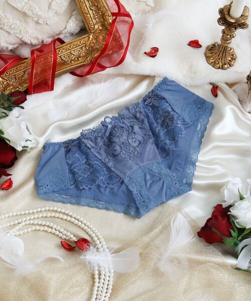 身生地は伸縮性のあるなめらかな素材を使用しているため、さらりとした気持ちの良い履き心地です。履き込みは浅く、サイドの幅が広いため安定感があります。足口はレースを使用し、フィット感がある作りでしっかりとヒップを覆い、食い込みの苦手な方にもおすすめです。