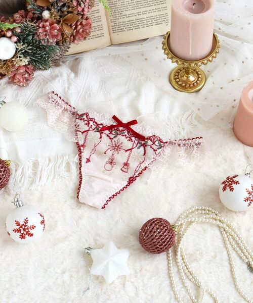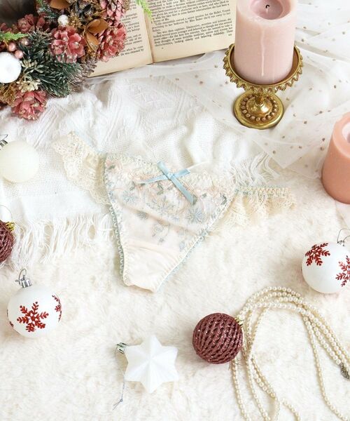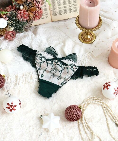 キラキラと揺れるオーナメントをモチーフにした、リサマリのクリスマスコレクションです。レースには窓辺に飾られているリボンやモミの木、ベルや鈴をふんだんに刺繍して、オーナメントがゆらゆらと揺れている様子を可愛らしく表現。窓の外に降り積もる雪の結晶を、たっぷりのラメ糸で豪華にあしらいました。フロント上辺はシンプルなレースで2段になるよう切り替えて、刺繍1つ1つを引き立たせるナチュラルな上品さを演出。バックスタイルは大胆なカッティングと、大きなチュールリボンを添えて、ホリデー気分高まる特別感をプラスしています。年に1度のクリスマスシーズンは、Risa Magliのランジェリーでヒロインに。心ときめく素敵なひと時をお過ごしください。