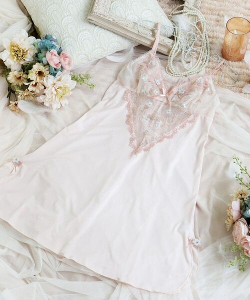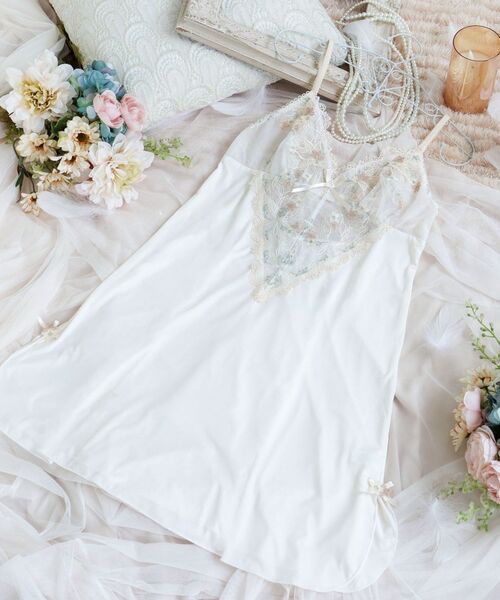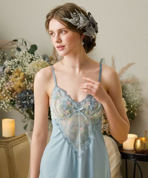 可憐に咲くアベリアのお花をイメージしたシリーズです。レースにはラフなステッチで大胆に描いたアベリアと小花を刺繍して、その上からお揃いのチュールアップリケをあしらうことで、奥行きのある繊細な仕上がりに。さらにツイード風の網目模様をほどこした小花のアップリケを重ねて、キラキラと輝くラメ糸とワンポイントのカラーリングが、お花がふわっと浮き出ている様子を可愛らしく表現しています。カップ上辺には幾何学模様を立体的なインケミ手法でほどこして、エレガントな美しさに。前身頃にはお揃いの刺繍レースを、バックスタイルにはストレッチレースをふんだんにあしらい、360度どこから見てもこだわりを詰め込んだ豪華なスタイルが完成しました。両サイドにはスリットとアップリケを添えて、動くたびにひらひらと揺れる裾が女性らしさを演出します。色展開も冬の空気に溶け込むような、やわらかく上品な雰囲気を醸し出すコレクションです。